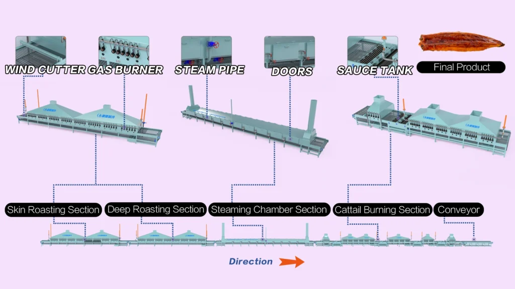 Our grilled eel processing line features scientific design, high efficiency, low cost, advanced technology, and flexible layout.