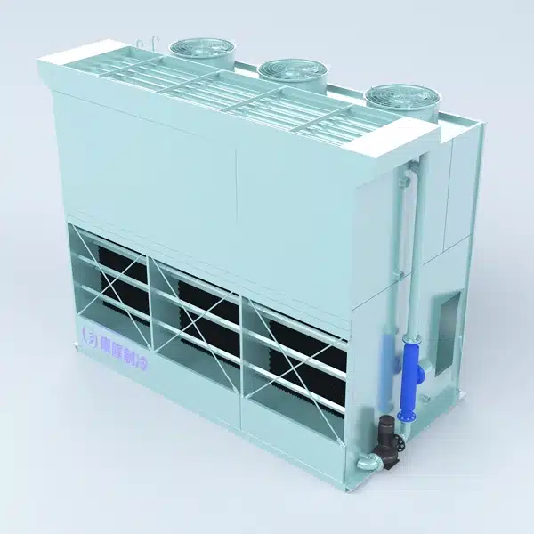The resulting warm, humid air is then drawn by the fan toward the top of the closed-loop cooler and discharged into the atmosphere. Non-evaporated water falls into the sump at the base of the unit, where it is recirculated by pumps through the water distribution system to re-enter the spray cycle over the coils.
