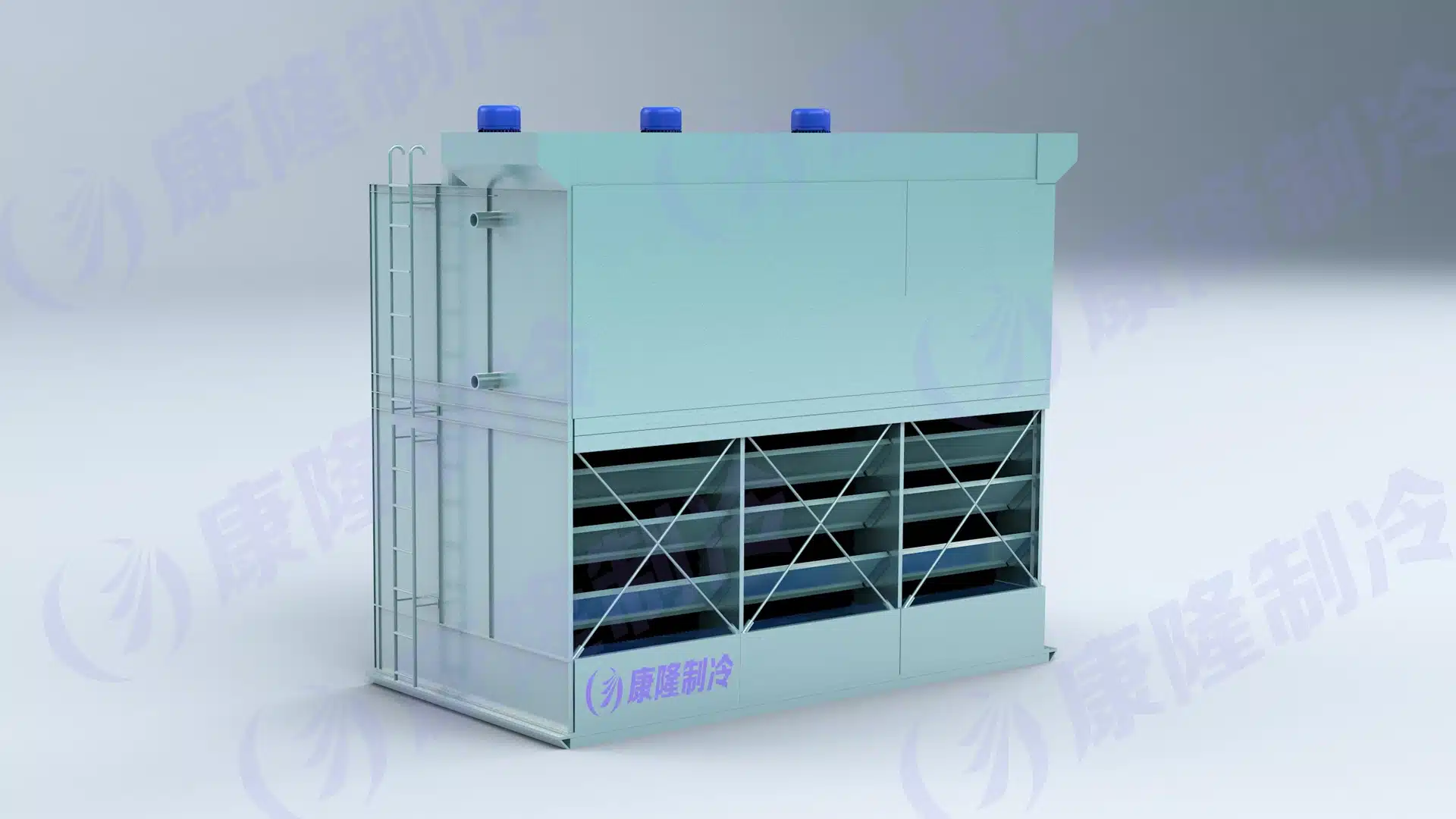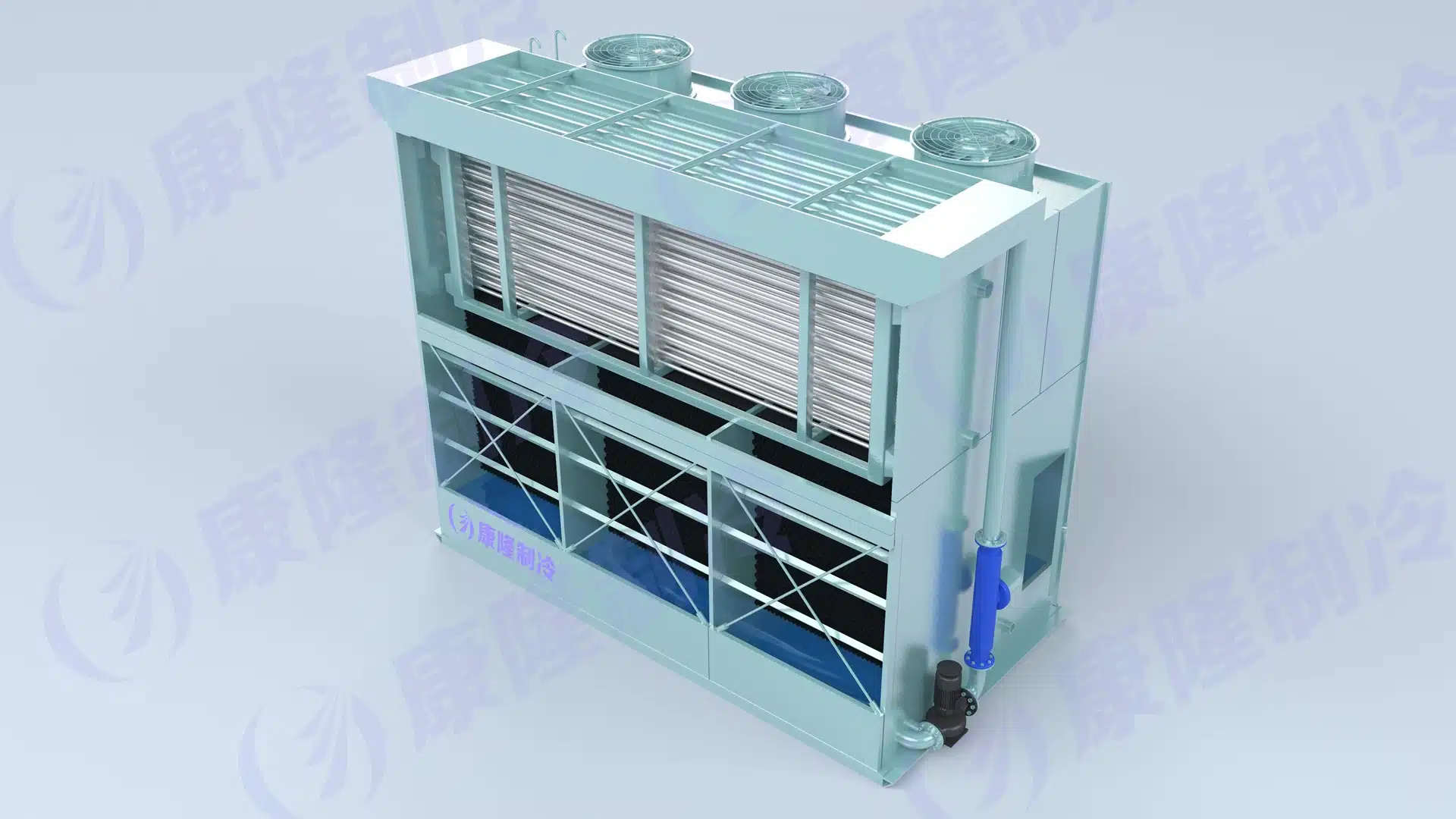 Simultaneously, ambient air is drawn through the intake louvers at the base of the unit. This air flows upward counter-current to the water direction, passing over the coil assembly. A portion of the water evaporates, absorbing latent heat of vaporization and thereby removing thermal energy from the system.