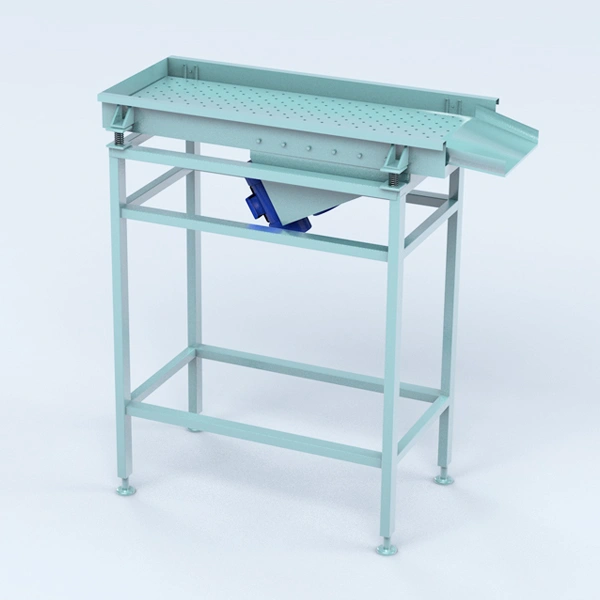 The main components of the vibrating distribution device include a vibrating bed, a screen plate, a support system, and a vibrating motor. This device utilizes the principle of vibratory translational motion, with the vibrating motor providing high-frequency vibration feeding. The vibrating structure is supported by four sets of rubber springs.