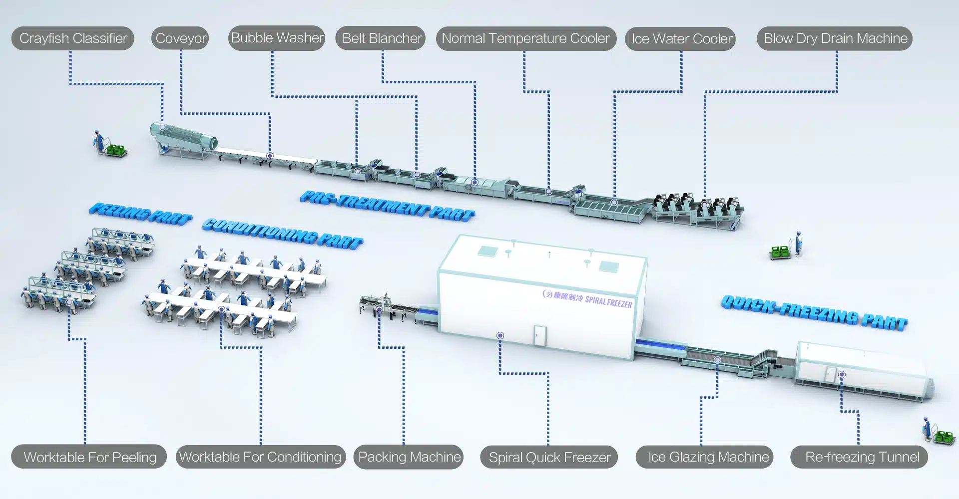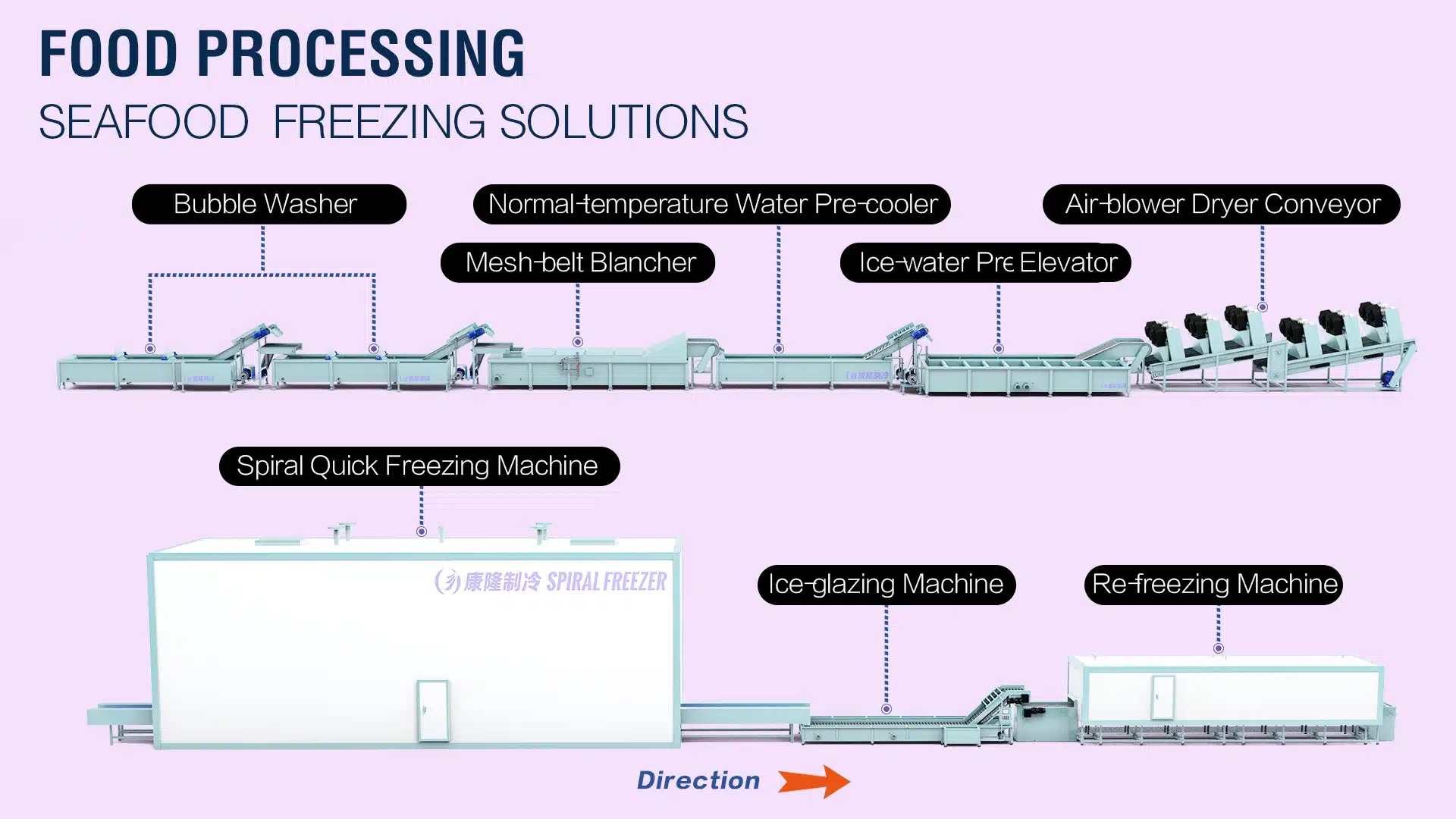 This seafood freezing production line is used to grade, steam, cool, quick-freeze, ice-cure, thaw, and harden seafood