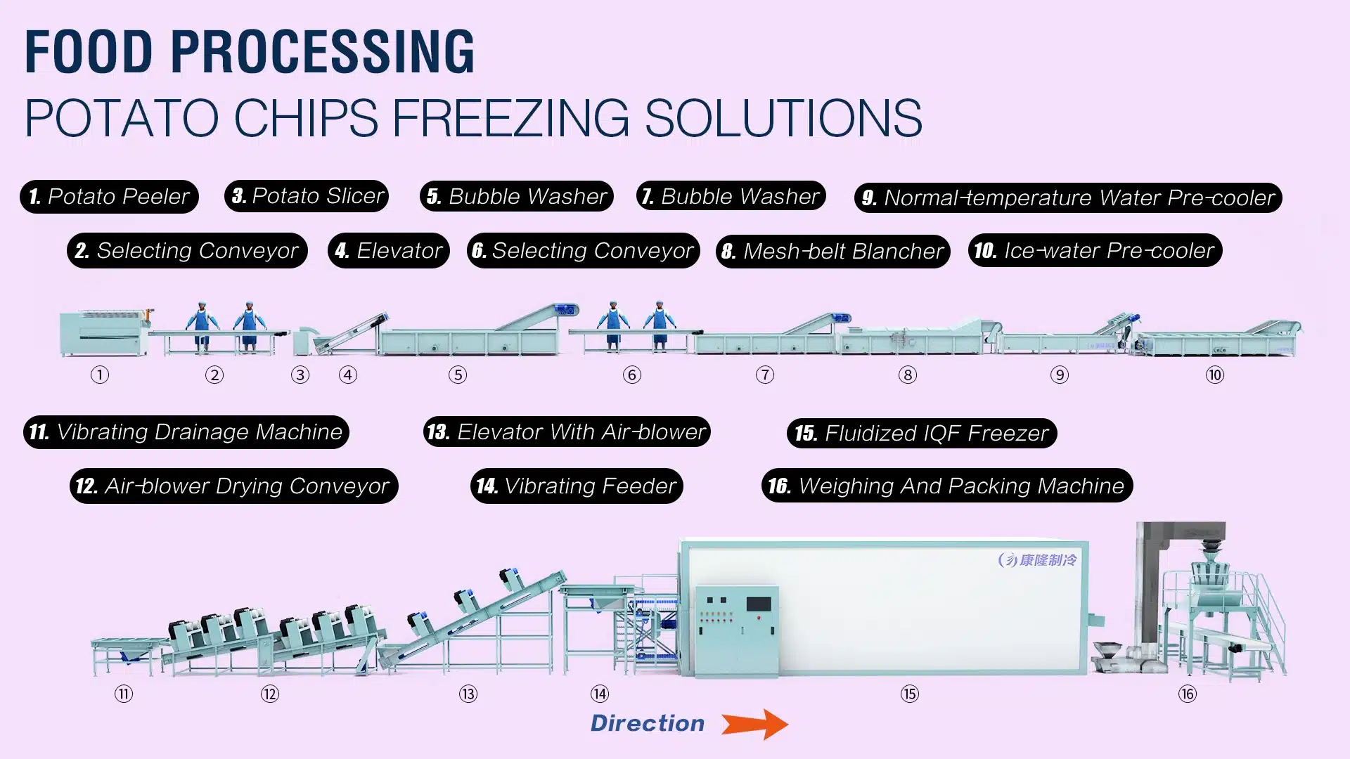 KLONG has many years of manufacturing experience. We offer complete processing lines for freezing fruit and vegetable products in granulated